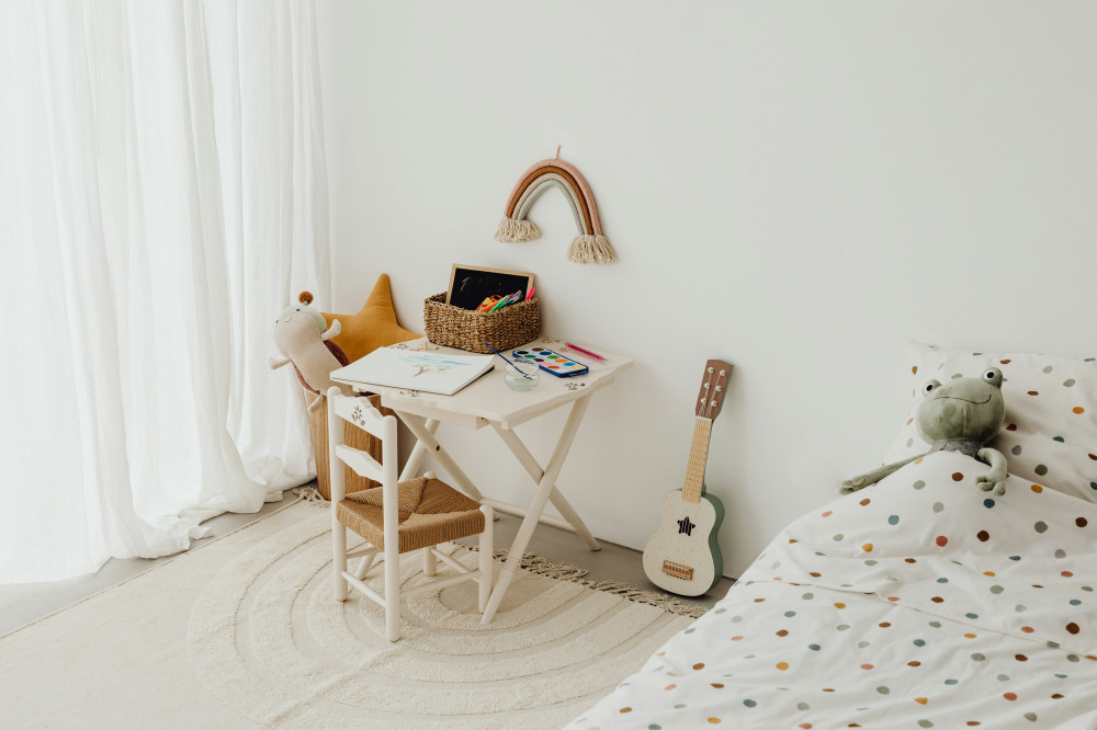 Materialer som tre, bomull og ull gir en lun og naturlig følelse, mens robuste overflater gjør det enkelt å holde rent. Det skal være et rom der man ikke trenger å være redd for å søle maling eller velte en kloss.